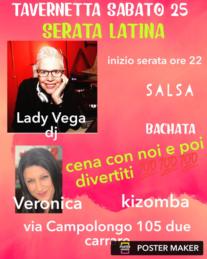 Giovedì 24 ottobre la Tavernetta si accende con la Serata Latina firmata Illenium Dance Academy. In consolle DJ BRU Little e sul palco la maestra Federica, con corsi di bachata e salsa (base alle 20.00, intermedio alle 21.00), seguiti da una lunga notte di salsa, bachata e kizomba dalle 22.00 in poi.