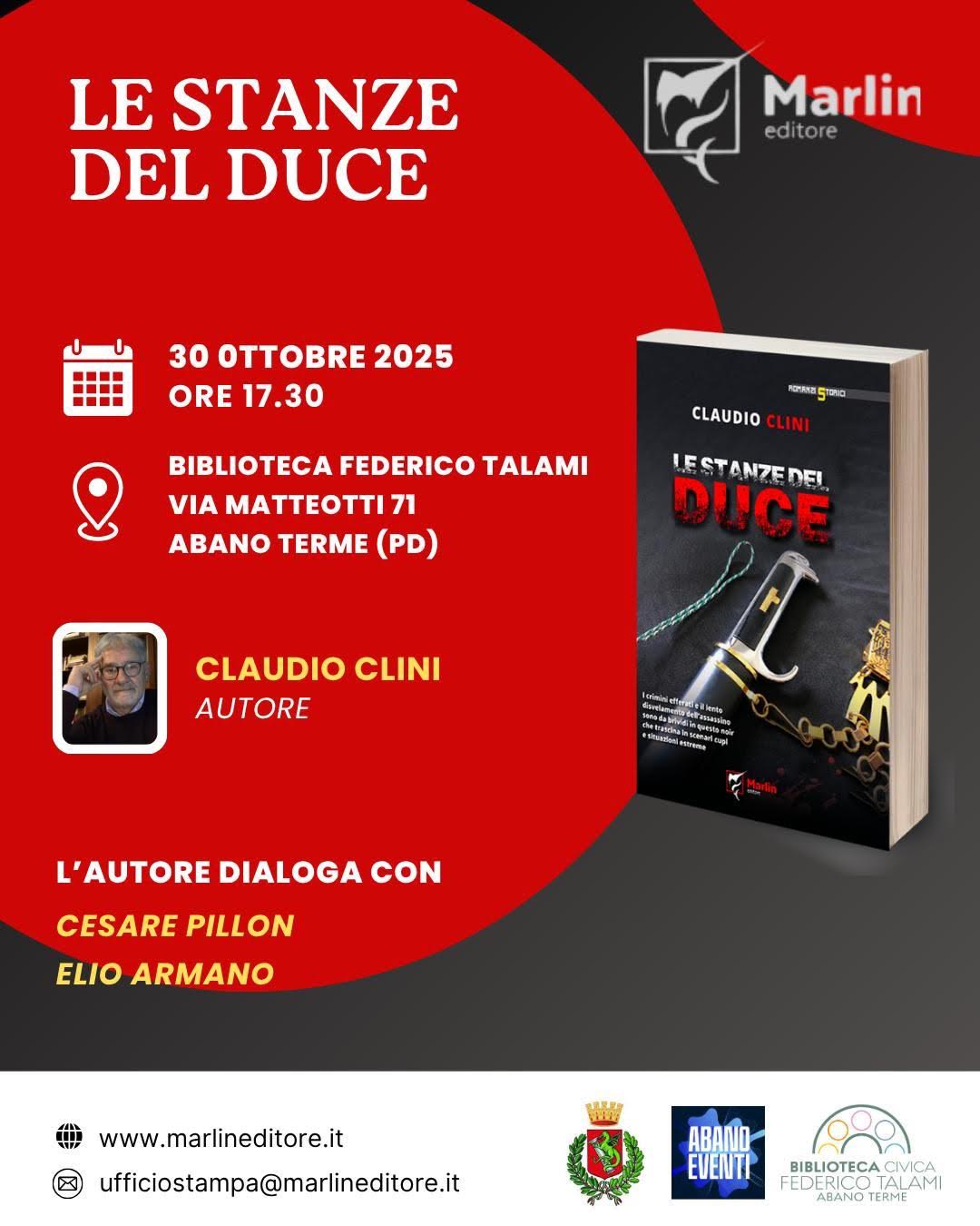 IL NUOVO LIBRO DI CLAUDIO CLINI “LE STANZE DEL DUCE”. Venerdì 30 ottobre 2025 ore 17:30 Biblioteca Federico Talami Abano Terme 29 ottobre 2025/in Editoriale, Eventi /da Aldo_Francisci